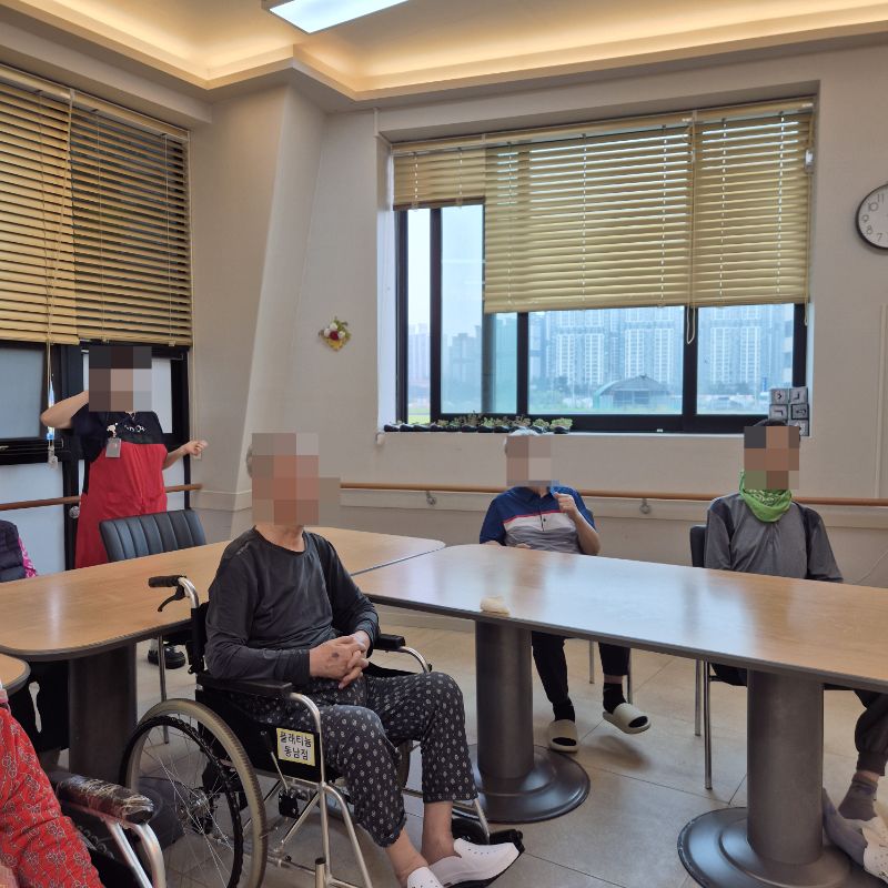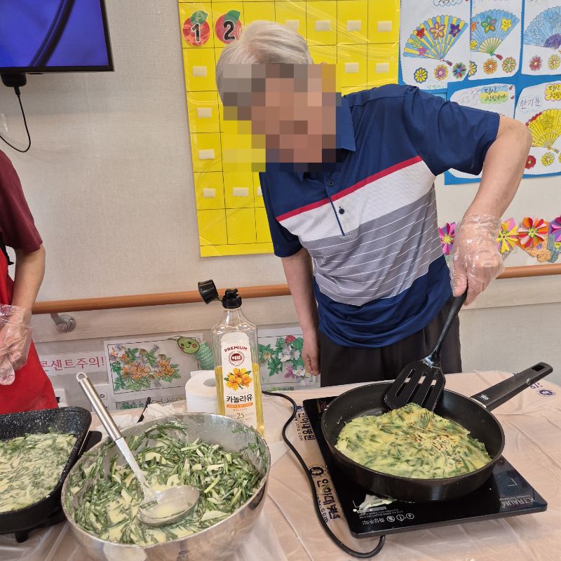 ⚬ 6월 2일 월요일_ 자기존중의 날 ⚬ 관리자 2025-06-02 17:15 오전프로그램 : 실버 체조-침대(신체)목표: 신체 움직임과 인지 훈련을 병행하여 뇌 기능 활성화,기억력, 주의력, 언어 능력 등 인지 기능 강화,혈액순환 개선과 신체 활동량 증가,긍정적인 정서 유도 및 스트레스 감소한다.기대효과: 신체 움직임과 인지 자극을 통해 뇌의 다양한 영역 활성화.손발 움직임을 통해 전신 혈류 촉진.긍정적인 활동으로 스트레스 감소 및 삶의 활력을 증대한다.오후프로그램 : 부추전 만들기(요리)목표: 여러 어르신들과 다함께 전을 지지며, 공감대를 형성, 과거 기억을 회상한다.기대효과: 회상활동을 통해 좋은기억의 유지및 자존감 향상, 눈과 손의 협응력, 집중력 및 생활의 활력소 도모, 함께하는 즐거움 느낀다. 다음글 ⚬ 6월 3일 화요일_ 호기심의 날 ⚬ 이전글 ⚬ 5월 30일 금요일_ 여가지원의 날 ⚬ 목록