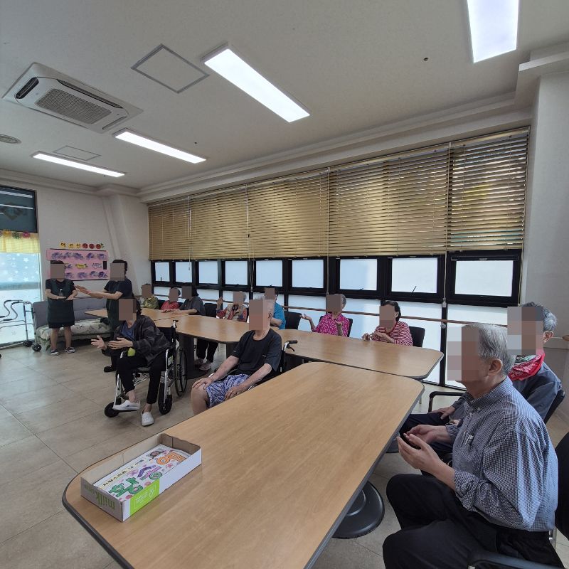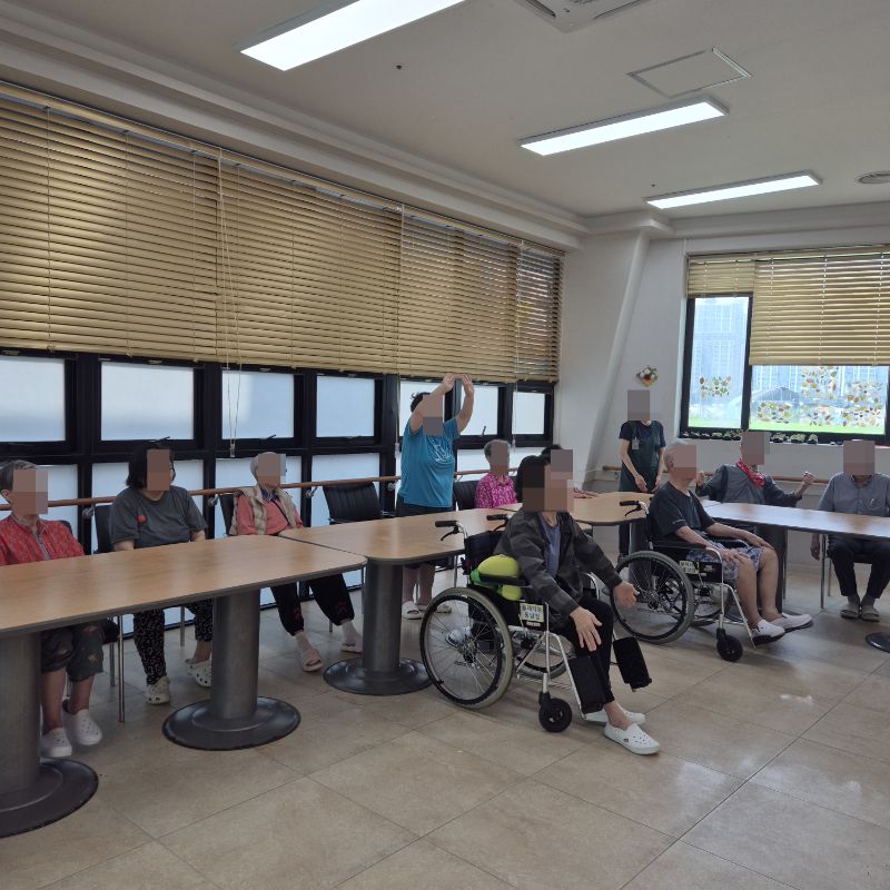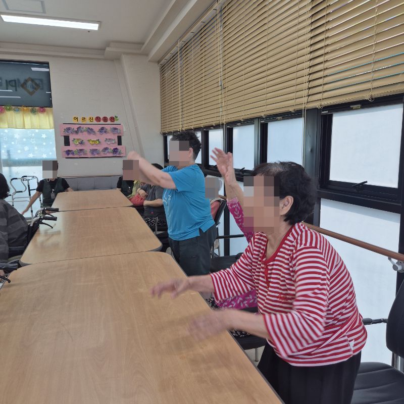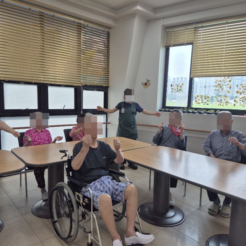 ⚬ 7월 7일 월요일_ 자기존중의 날 ⚬ 관리자 2025-07-07 17:11 오전프로그램 : 외부강사 – (인지)목표: 인지향상에 도움을 주고받으며 원하는 작품을 완성할때 성취감을 준다.기대효과: 소근육발달과 작품의 완성함을 보며 성취감을 느끼며 만족감을 형성한다.오후프로그램 : 국민 체조(신체)목표: 전신 근육의 균형 있는 사용으로 신체 건강 유지, 유연성 및 근력을 강화하여 일상생활 동작 수행 능력 향상, 심폐 기능 개선과 혈액순환 촉진, 규칙적인 운동 습관 형성 및 정서적 안정을 도모한다.기대효과: 관절 가동 범위와 균형감각이 개선되어 일상생활에서의 움직임이 원활해짐. 음악과 함께하는 국민체조는 재미와 동기부여를 제공하여 심리적 만족감을 높인다. 다음글 ⚬ 7월 8일 화요일_ 호기심의 날 ⚬ 이전글 ⚬ 7월 4일 금요일_ 여가지원의 날 ⚬ 목록
