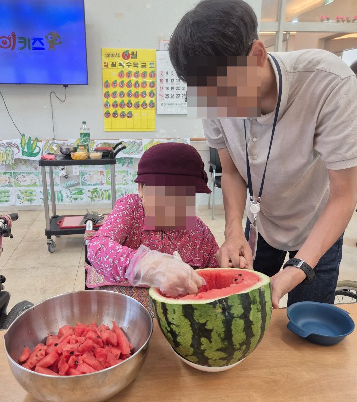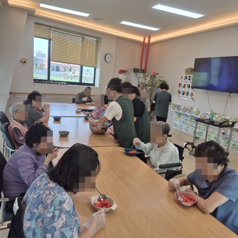 ⚬ 7월 30일 수요일_ 창의성의 날 ⚬ 관리자 2025-07-30 17:27 오전프로그램 : 달력만들기(인지)목표: 수를 순서대로 구분할 수 있도록 하고, 계절에 따른 특징과 변화를 잘 인식하여 표현할 수 있도록 하고, 진행자가 제시하는 작업과정에 집중하여 지시과제를 수행하며, 과제지시를 적절히 판단하여 집행하는 능력을 증가시킨다.기대효과: 연산기능을 통한 인지기능 향상. 숫자에 대한 인식기능 향상한다.오후프로그램 : 수박화채(요리)목표: 여러 어르신들과 다함께 수박을 떠내고 부재료를 넣으며, 공감대를 형성, 재료에 따른 맛을 느끼고 표현한다.기대효과: 좋은기억의 유지및 자존감 향상, 눈과 손의 협응력, 집중력 및 생활의 활력소 도모, 함께하는 즐거움 느끼고 맛을 표현하며 정서기능의 향상을 도모한다. 다음글 ⚬ 8월 1일 금요일_ 여가지원의 날 ⚬ 이전글 ⚬ 7월 29일 화요일_ 호기심의 날 ⚬ 목록