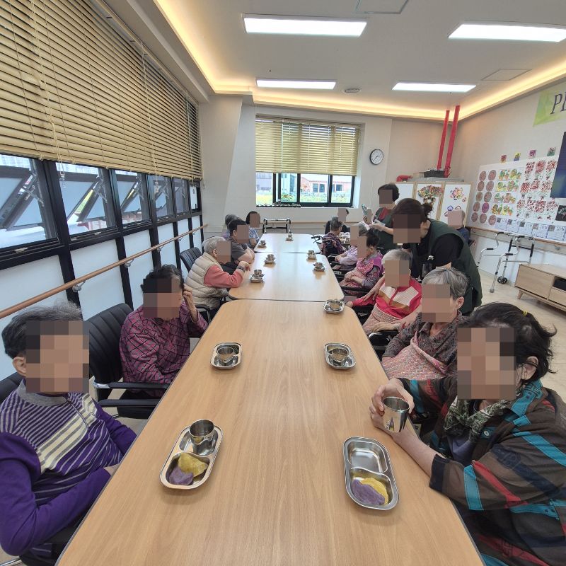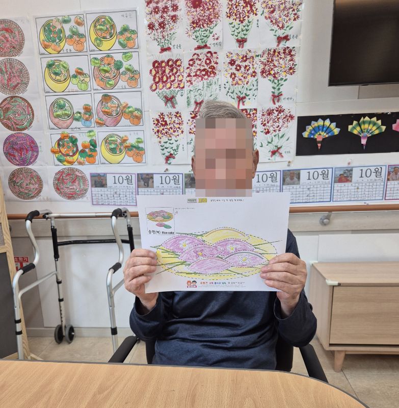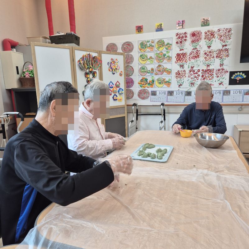 ⚬ 10월 3일 금요일_ 여가지원의 날 ⚬ 관리자 2025-10-03 17:42 오전프로그램 : 외부강사 – (인지)목표: 인지향상에 도움을 주고받으며 원하는 작품을 완성할때 성취감을 준다.기대효과: 소근육발달과 작품의 완성함을 보며 성취감을 느끼며 만족감을 형성한다.송편만들기(요리)목표: 여러 어르신들과 다함께 송편를 빚으며, 공감대를 형성, 과거 기억을 회상한다.기대효과: 명절에 만드는 송편을 통해 정서기능을 향상한다.오후프로그램 : 실버 체조(침대)(신체)목표: 신체 움직임과 인지 훈련을 병행하여 뇌 기능 활성화, 기억력, 주의력, 언어 능력 등 인지 기능 강화, 혈액순환 개선과 신체 활동량 증가, 긍정적인 정서 유도 및 스트레스 감소한다.기대효과: 신체 움직임과 인지 자극을 통해 뇌의 다양한 영역 활성화. 손발 움직임을 통해 전신 혈류 촉진. 긍정적인 활동으로 스트레스 감소 및 삶의 활력을 증대한다. 다음글 ⚬ 10월 7일 화요일_ 호기심의 날 ⚬ 이전글 ⚬ 10월 1일 수요일_ 창의성의 날 ⚬ 목록