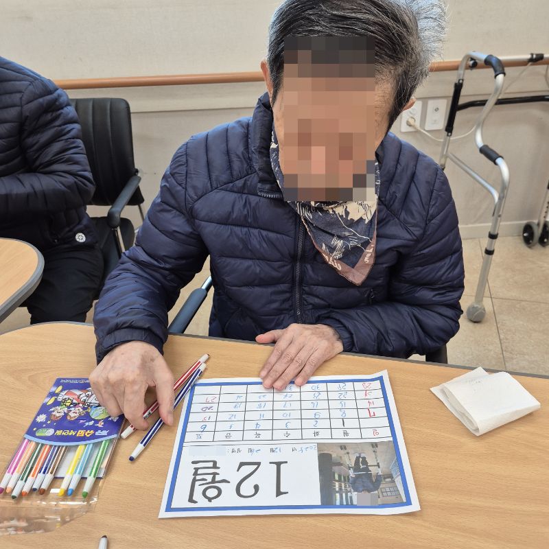 ⚬ 11월 26일 수요일_ 창의성의 날 ⚬ 관리자 2025-11-26 17:24 오전프로그램 : 외부강사- 레크레이션 (여가)목표: 레크레이션을 통해 어르신들의 신체활동을 향상한다 .기대효과: 몸을 움직이며 대∙소근육과 신진대사에 도움을 준다.오후프로그램 : 달력만들기 (인지)목표: 수를 순서대로 구분할 수 있도록 하고, 계절에 따른 특징과 변화를 잘 인식하여 표현할 수 있도록한다기대효과: 연산기능을 통한 인지기능 향상 및 숫자에 대한 인식기능을 향상한다. 다음글 ⚬ 11월 28일 금요일_ 여가지원의 날 ⚬ 이전글 ⚬ 11월 25일 화요일_ 호기심의 날 ⚬ 목록
