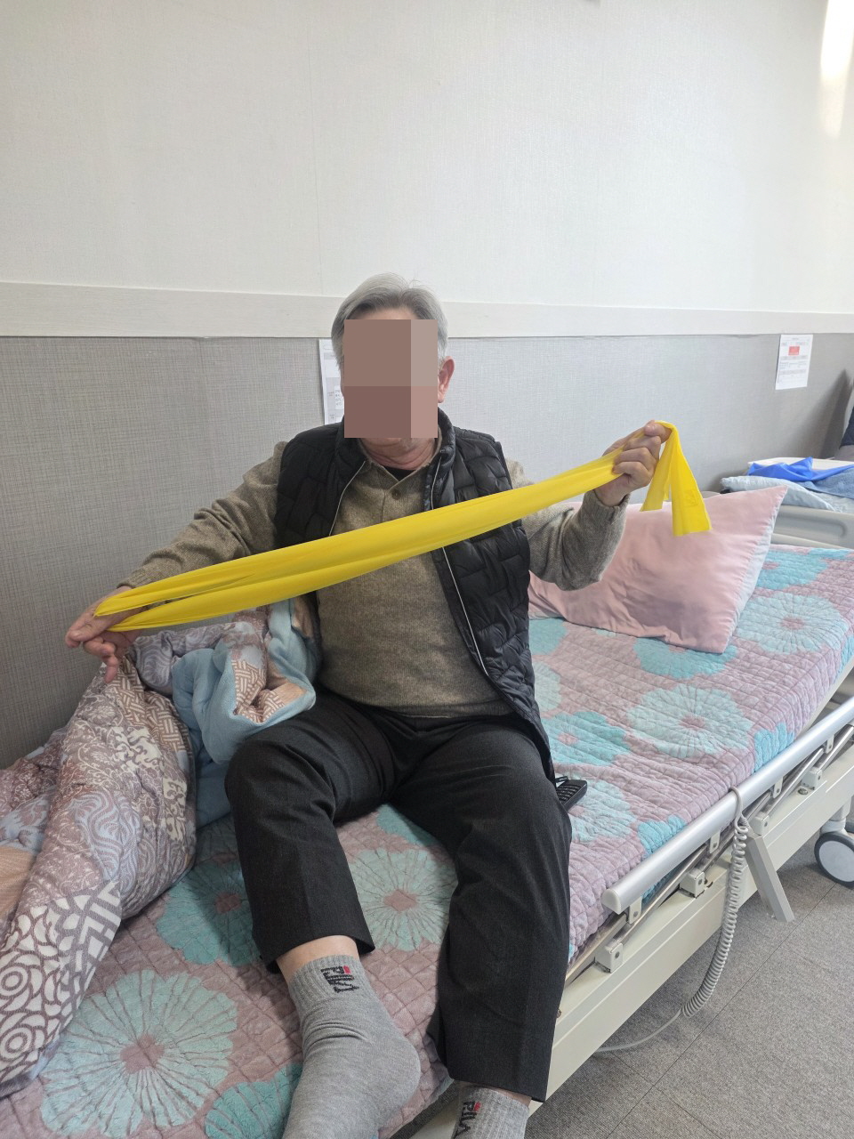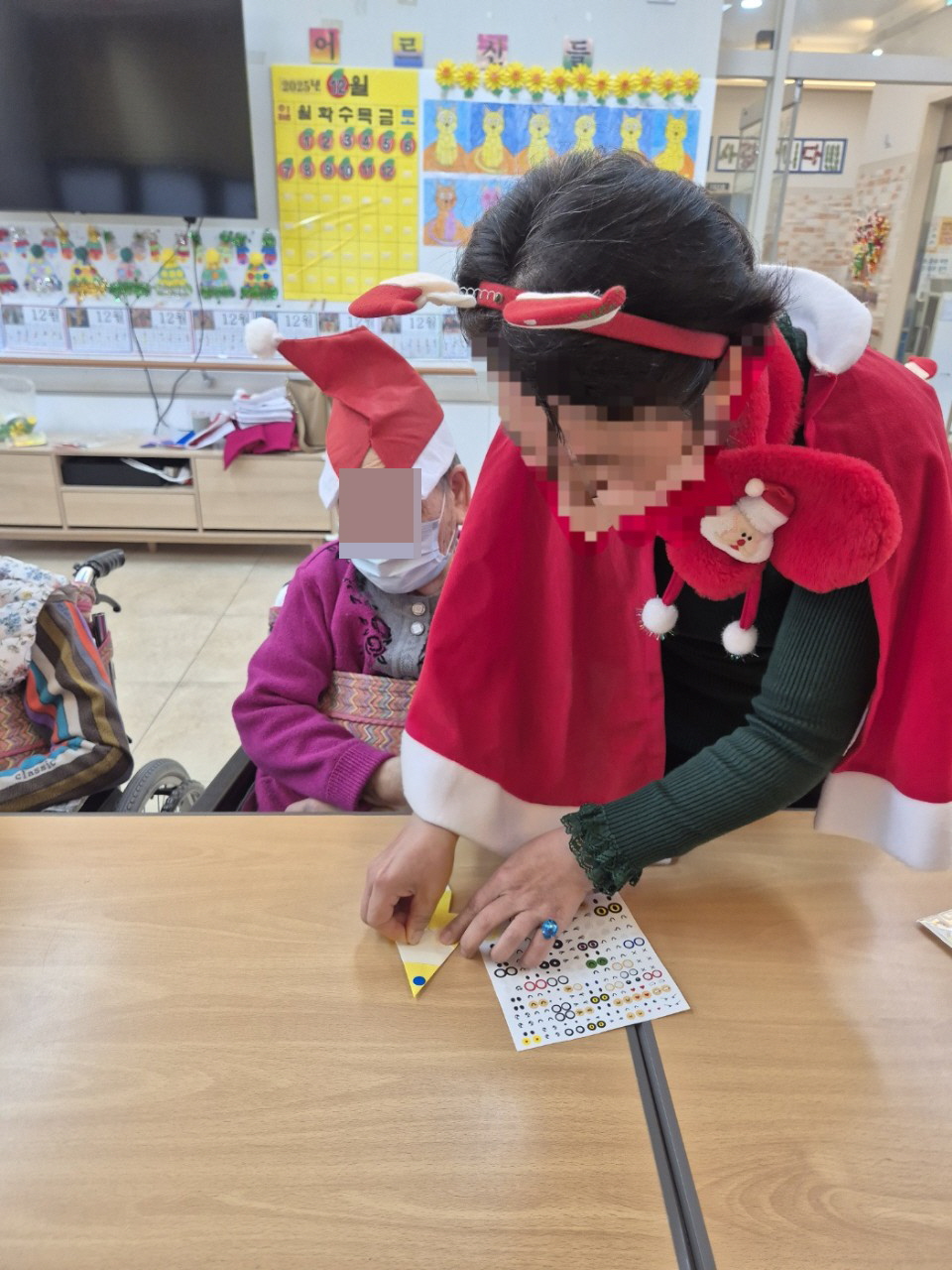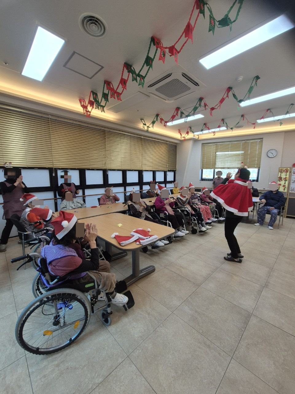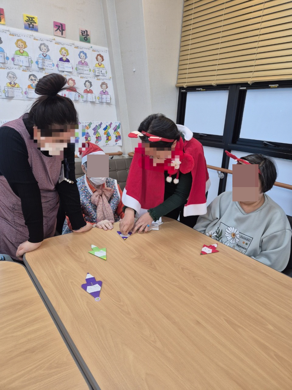 ⚬ 12월 12일 금요일_ 여가지원의 날 ⚬ 관리자 2025-12-22 17:25 오전프로그램 : 외부강사 – (인지)목표: 인지향상에 도움을 주고며 원하는 작품을 완성할때 성취감을 준다. 계절에 맞는 재료의 내용을 살펴 보고 경험담을 이야기 나눠 본다.기대효과: 계절에 맞는 재료를 사용하여 계절의 변화에 적응할수 있다. 경험담을 이야기하며 자신감을 갖는다.오후프로그램 : 밴드 스트레칭(신체)목표: 근육 유연성 증진 및 관절 가동 범위 확대. 통증 감소와 긴장 완화. 근육과 관절의 부상 예방. 전신 순환 개선으로 신체 활력 증대한다.기대효과: 근육과 관절의 유연성 향상으로 움직임 개선. 긴장된 근육과 통증 완화로 신체적 편안함 제공. 혈액순환 개선으로 신체 활력 증대. 스트레스 감소 및 정서적 안정감 증대. 일상생활 동작 수행 능력 강화한다. 다음글 ⚬ 12월 15일 월요일_ 자기존중의 날 ⚬ 이전글 ⚬ 12월 10일 수요일_ 창의성의 날 ⚬ 목록