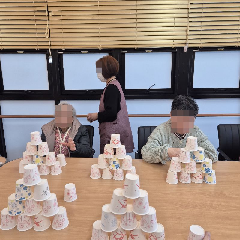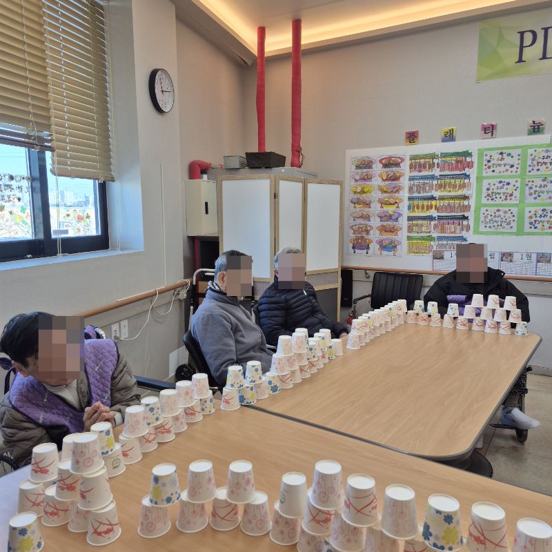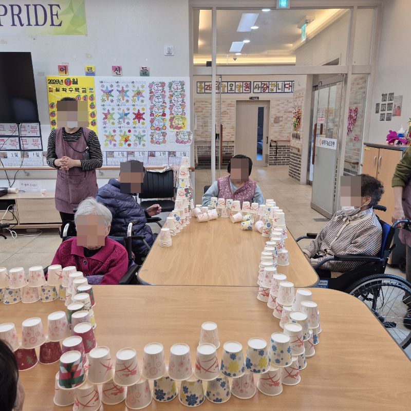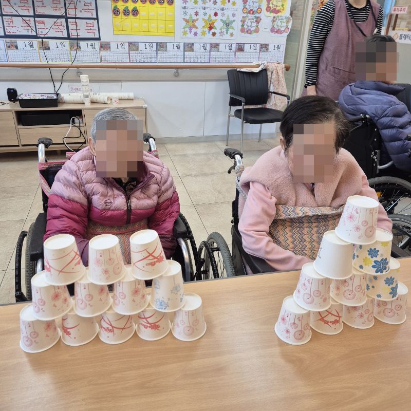 ⚬ 1월 27일 화요일_ 호기심의 날 ⚬ 관리자 2026-01-27 17:38 오전프로그램 : 종이컵 쌓기(여가)목표: 손의 조직력 및 집중력 향상에 도움이 되며 쌓고 무너뜨리는 활동으로 정서 순환에 도움이 된다.기대효과: 신체기능 증진, 인지기능, 다양한 자극을 느낄 수 있다.오후프로그램 : 외부강사 – (인지)목표: 인지향상에 도움을 주고며 원하는 작품을 완성할때 성취감을 준다. 재료의 내용과 사용방법의 변화 알아본다.기대효과: 새로운 소재의 재료로 창의력을 증진한고 완성된 작품을 보며 성취감을 느껴 만족감 형성 한다. 다음글 ⚬ 1월 28일 수요일_ 창의성의 날 ⚬ 이전글 ⚬ 1월 26일 월요일_ 자기존중의 날 ⚬ 목록