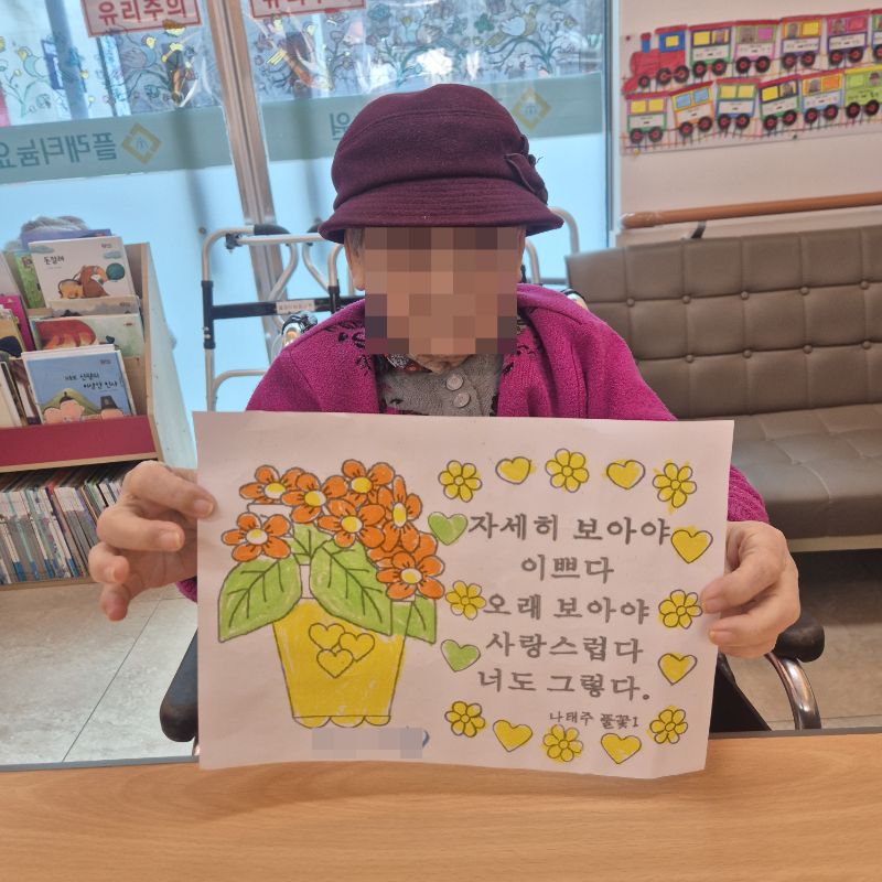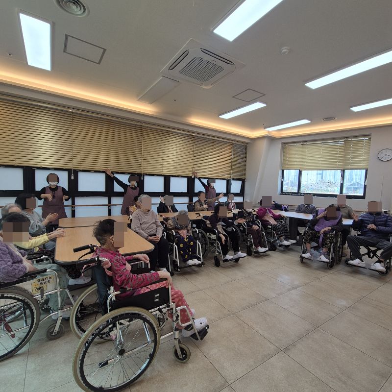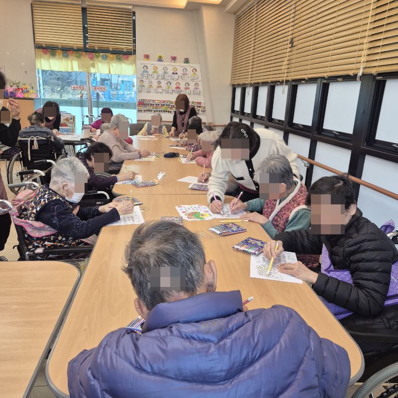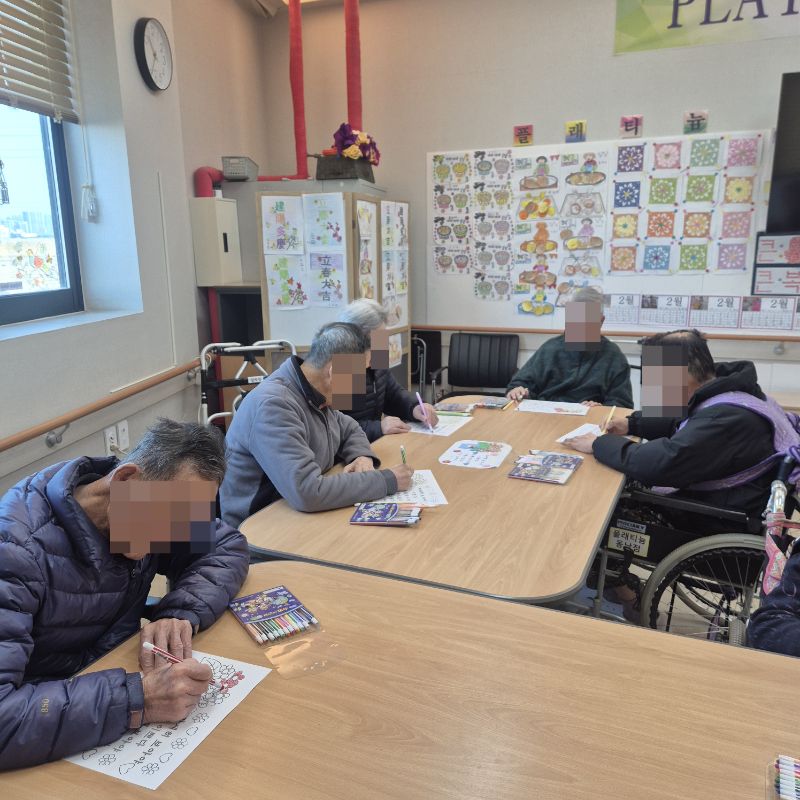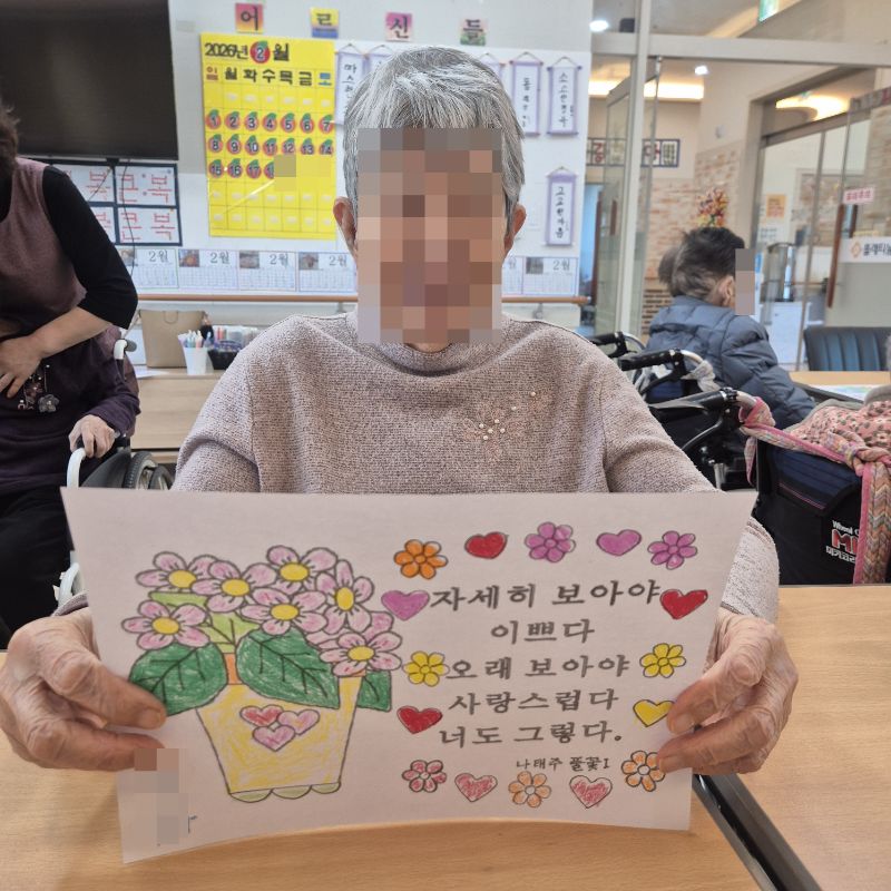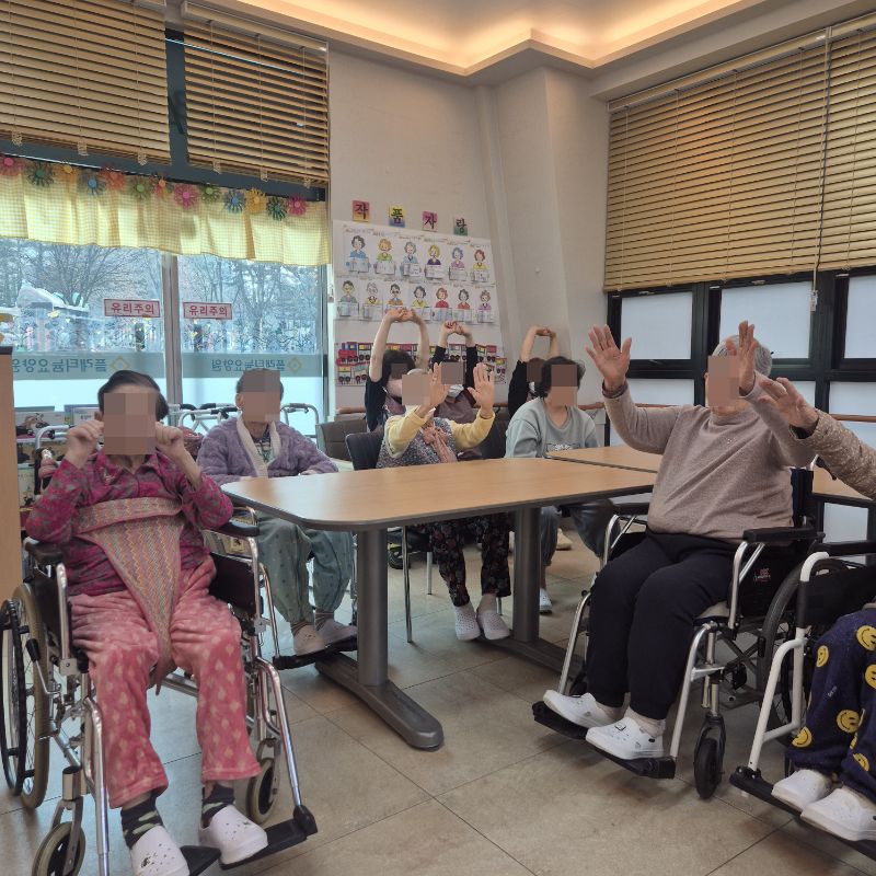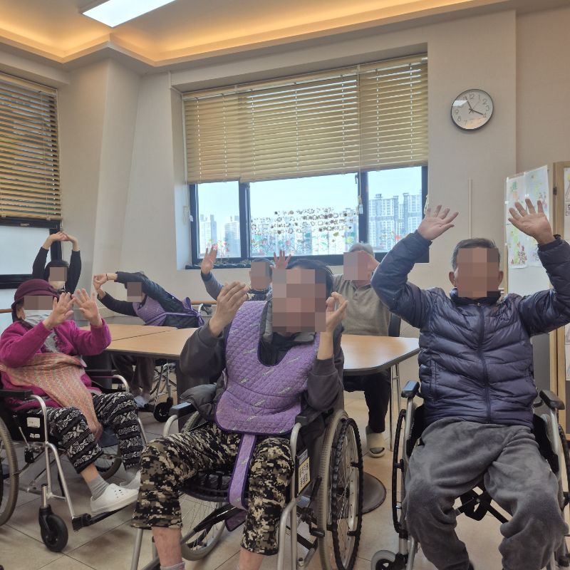 ⚬ 2월 20일 금요일_ 여가지원의 날 ⚬ 관리자 2026-02-20 17:14 오전프로그램 : 외부강사 – (인지)목표: 인지향상에 도움을 주고며 원하는 작품을 완성할때 성취감을 준다. 계절에 맞는 재료의 내용을 살펴 보고 경험담을 이야기 나눠 본다.기대효과: 계절에 맞는 재료를 사용하여 계절의 변화에 적응할수 있다. 경험담을 이야기하며 자신감을 갖는다.오후프로그램 : 침상 관절 운동(신체)목표: 관절의 가동 범위 유지 및 개선. 근육 경직 예방과 혈액순환 촉진. 욕창과 근골격계 합병증 방지. 전신의 이완과 정서적 안정 도모한다.기대효과: 관절 유연성과 근력 강화로 신체기능 유지 및 개선. 삼킴 능력 향상으로 안전한 섭취 지원. 손과 팔의 조작 능력 향상으로 일상생활 자립도 증가. 균형 감각 및 조화운동 능력 개선으로 낙상 위험 감소. 지구력 증대로 신체 활동량 증가 및 전신 건강 증진한다. 다음글 ⚬ 2월 23일 월요일_ 자기존중의 날 ⚬ 이전글 ⚬ 2월 18일 수요일_ 창의성의 날 ⚬ 목록