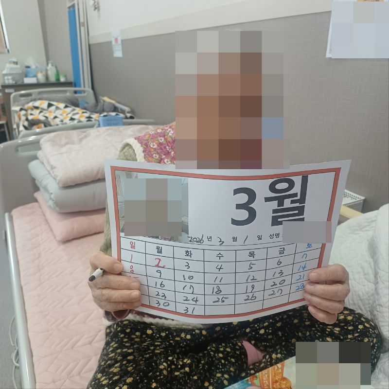 ⚬ 2월 25일 수요일_ 창의성의 날 ⚬ 관리자 2026-02-25 17:37 오전프로그램 : 외부강사- 레크레이션 (여가)목표: 레크레이션을 통해 어르신들의 신체활동을 향상한다 .기대효과: 몸을 움직이며 대∙소근육과 신진대사에 도움을 준다.오후프로그램 : 새로운달 알아보기(인지)목표: 숫자를 알고 기억해 순서대로 써보고 계절의 변화를 알 수 있다. 스티커를 붙이며 소근육을 증진한다.기대효과: 숫자를 기억하여 인지 기능 향상한다. 계절지남력 향상한다. 다음글 ⚬ 2월 27일 금요일_ 여가지원의 날 ⚬ 이전글 ⚬ 2월 24일 화요일_ 호기심의 날 ⚬ 목록