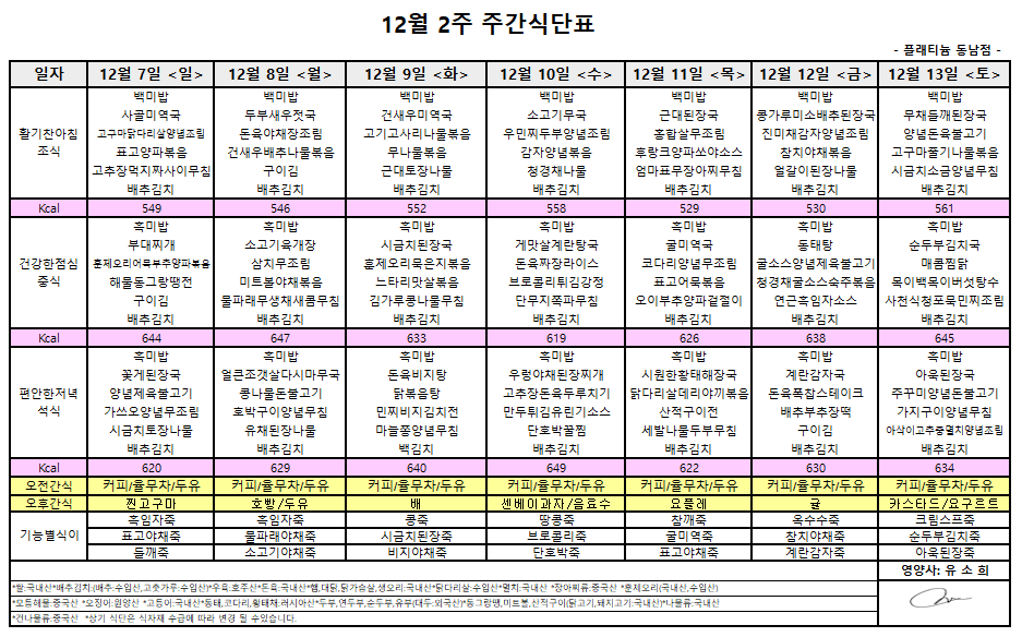 ㅇ 12월2주 식단표 ㅇ