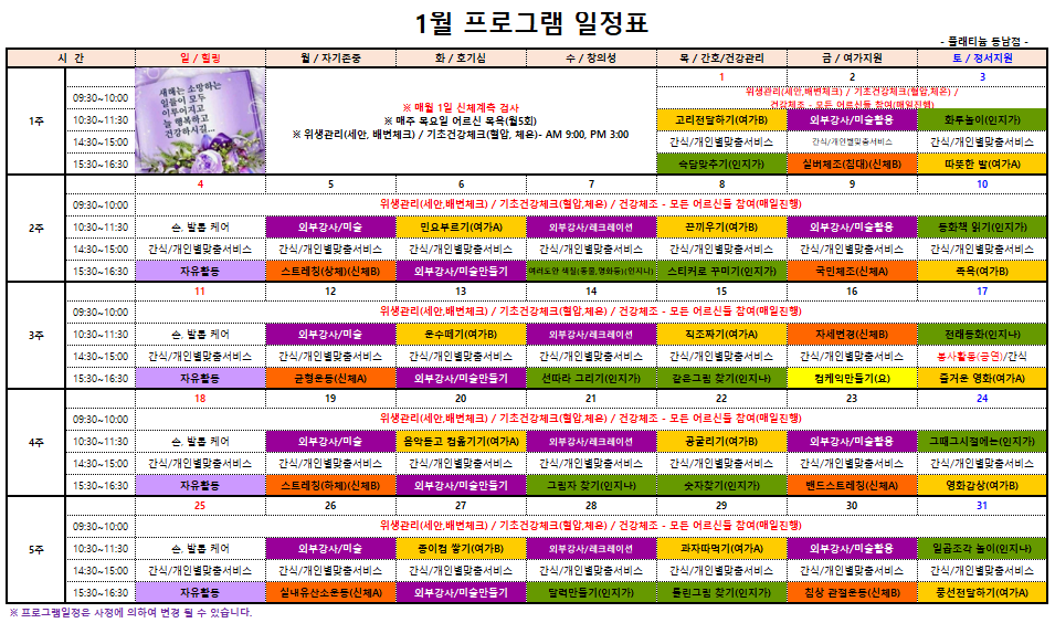 ㅇ 2026년 1월 프로그램 일정표 ㅇ 관리자 2025-12-31 17:25 ** 원 사정에 의해 변경될수 있습니다. 다음글 ㅇ 1월2주 식단표 ㅇ 이전글 ㅇ 2026년 1월1주 식단표 ㅇ 목록