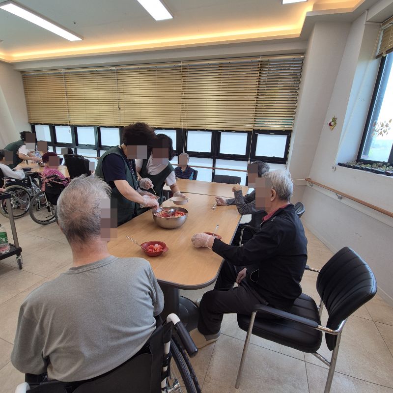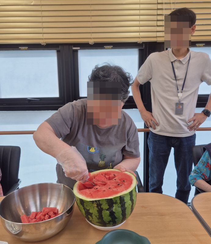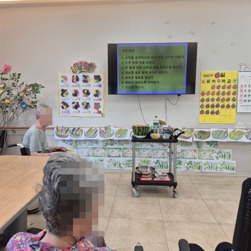 ⚬ 7월 30일 수요일_ 창의성의 날 ⚬ 관리자 2025-07-30 17:27 오전프로그램 : 달력만들기(인지)목표: 수를 순서대로 구분할 수 있도록 하고, 계절에 따른 특징과 변화를 잘 인식하여 표현할 수 있도록 하고, 진행자가 제시하는 작업과정에 집중하여 지시과제를 수행하며, 과제지시를 적절히 판단하여 집행하는 능력을 증가시킨다.기대효과: 연산기능을 통한 인지기능 향상. 숫자에 대한 인식기능 향상한다.오후프로그램 : 수박화채(요리)목표: 여러 어르신들과 다함께 수박을 떠내고 부재료를 넣으며, 공감대를 형성, 재료에 따른 맛을 느끼고 표현한다.기대효과: 좋은기억의 유지및 자존감 향상, 눈과 손의 협응력, 집중력 및 생활의 활력소 도모, 함께하는 즐거움 느끼고 맛을 표현하며 정서기능의 향상을 도모한다. 다음글 ⚬ 8월 1일 금요일_ 여가지원의 날 ⚬ 이전글 ⚬ 7월 29일 화요일_ 호기심의 날 ⚬ 목록