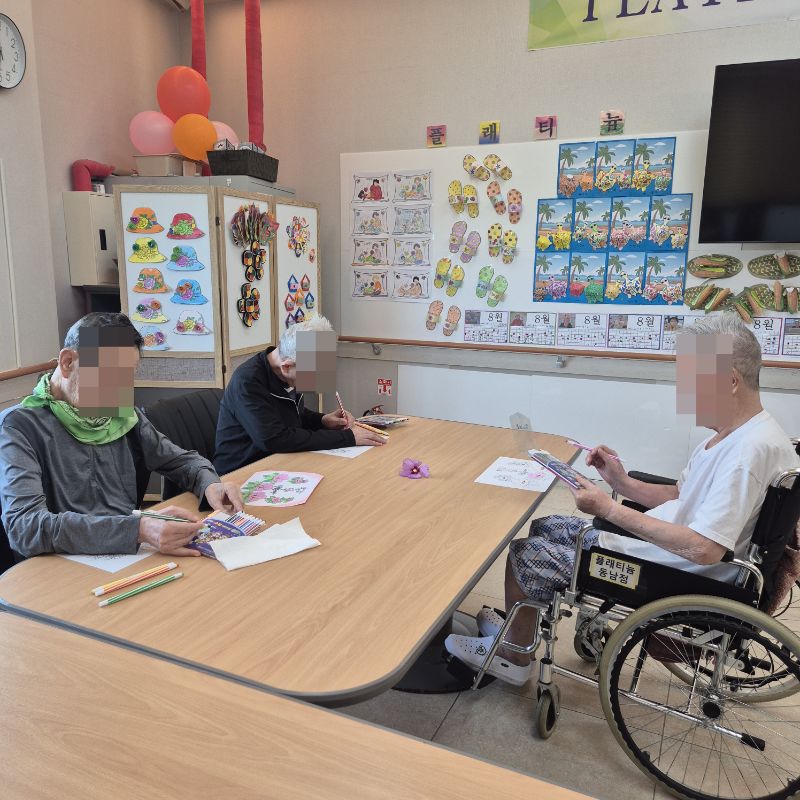 ⚬ 8월 15일 금요일_ 여가지원의 날 ⚬ 관리자 2025-08-15 17:27 오전프로그램 : 외부강사 - (인지)목표: 인지향상에 도움을 주고며 원하는 작품을 완성할때 성취감을 준다. 계절에 맞는 재료의 내용을 살펴 보고 경험담을 이야기 나눠 본다.기대효과: 계절에 맞는 재료를 사용하여 계절의 변화에 적응할수 있다. 경험담을 이야기하며 자신감을 갖는다.오후프로그램 :실내 유산소 운동(신체)목표: 심폐 기능 강화 및 혈액순환 촉진. 근육 사용을 통한 체력 유지 및 개선. 스트레스 완화와 심리적 안정. 신체 활동량 증가로 생활의 활력 증대한다.기대효과: 심폐 기능 강화로 건강 유지 및 질병 예방.신 체의 움직임을 통한 기초 체력 향상. 스트레스 감소와 활력 증진. 낙상 위험 감소 및 균형 감각 강화. 그룹 활동 시 교류 증대 및 사회적 연결감 향상한다. 다음글 ⚬ 8월 19일 화요일_ 호기심의 날 ⚬ 이전글 ⚬ 8월 13일 수요일_ 창의성의 날 ⚬ 목록