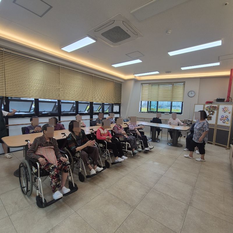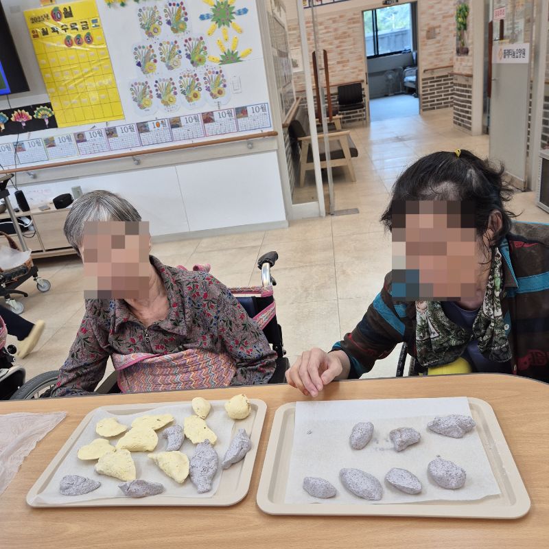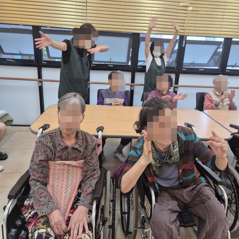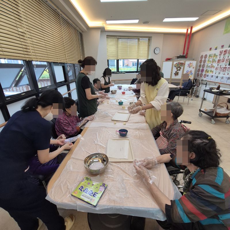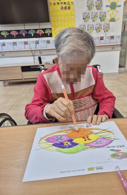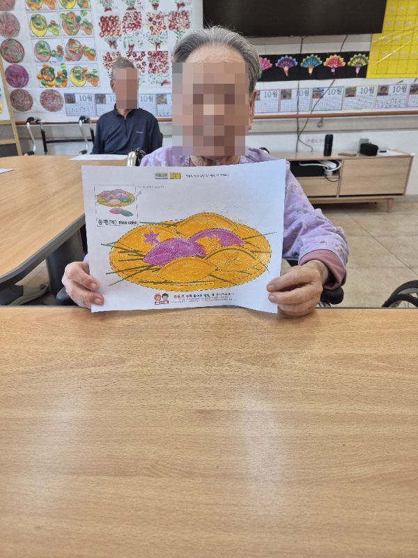 ⚬ 10월 3일 금요일_ 여가지원의 날 ⚬ 관리자 2025-10-03 17:42 오전프로그램 : 외부강사 – (인지)목표: 인지향상에 도움을 주고받으며 원하는 작품을 완성할때 성취감을 준다.기대효과: 소근육발달과 작품의 완성함을 보며 성취감을 느끼며 만족감을 형성한다.송편만들기(요리)목표: 여러 어르신들과 다함께 송편를 빚으며, 공감대를 형성, 과거 기억을 회상한다.기대효과: 명절에 만드는 송편을 통해 정서기능을 향상한다.오후프로그램 : 실버 체조(침대)(신체)목표: 신체 움직임과 인지 훈련을 병행하여 뇌 기능 활성화, 기억력, 주의력, 언어 능력 등 인지 기능 강화, 혈액순환 개선과 신체 활동량 증가, 긍정적인 정서 유도 및 스트레스 감소한다.기대효과: 신체 움직임과 인지 자극을 통해 뇌의 다양한 영역 활성화. 손발 움직임을 통해 전신 혈류 촉진. 긍정적인 활동으로 스트레스 감소 및 삶의 활력을 증대한다. 다음글 ⚬ 10월 7일 화요일_ 호기심의 날 ⚬ 이전글 ⚬ 10월 1일 수요일_ 창의성의 날 ⚬ 목록