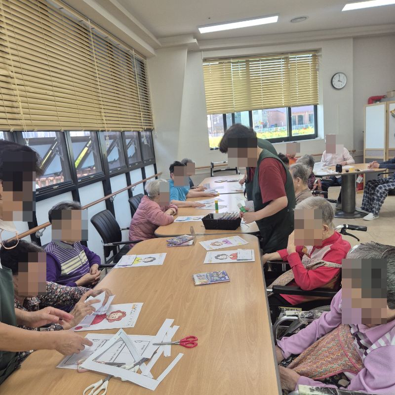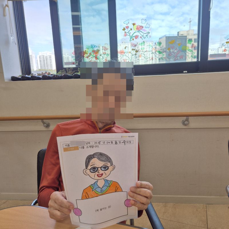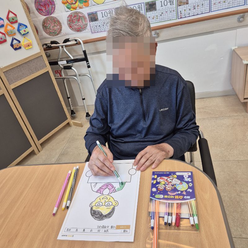⚬ 10월 8일 수요일_ 창의성의 날 ⚬ 관리자 2025-10-08 17:25 오전프로그램 : 여러 도안 색칠하기(인지)목표: 다양한 미술재료와 도구를 활용하여 자신의 생각과 느낌을 자유롭게 표현함으로써 정서적 안정감을 느낀다.기대효과: 손을 움직이며 색을 칠해봄으로써 소 근육을 발달 시킬 수 있다. 도안에서 색을 벗아나지 않게 집중해 집중력을 향상 시킬 수 있다. 오후프로그램 : 자랑스런 내이름(인지)목표: 이름에 대한 자랑스러움과 인지 향상에 도움을 주고 손 힘을 키우며 원하는 작품을 완성할 때 성취감을 느낀다.기대효과: 나의 이름을 자랑스럽게 생각하며 긍정적인 마음을 갖게한다. 소근육을 증진하고 여러가지 색감으로 기분전환을 한다. 작품을 완성하며 성취감을 느낀다. 다음글 ⚬ 10월 10일 금요일_ 여가지원의 날 ⚬ 이전글 ⚬ 10월 7일 화요일_ 호기심의 날 ⚬ 목록