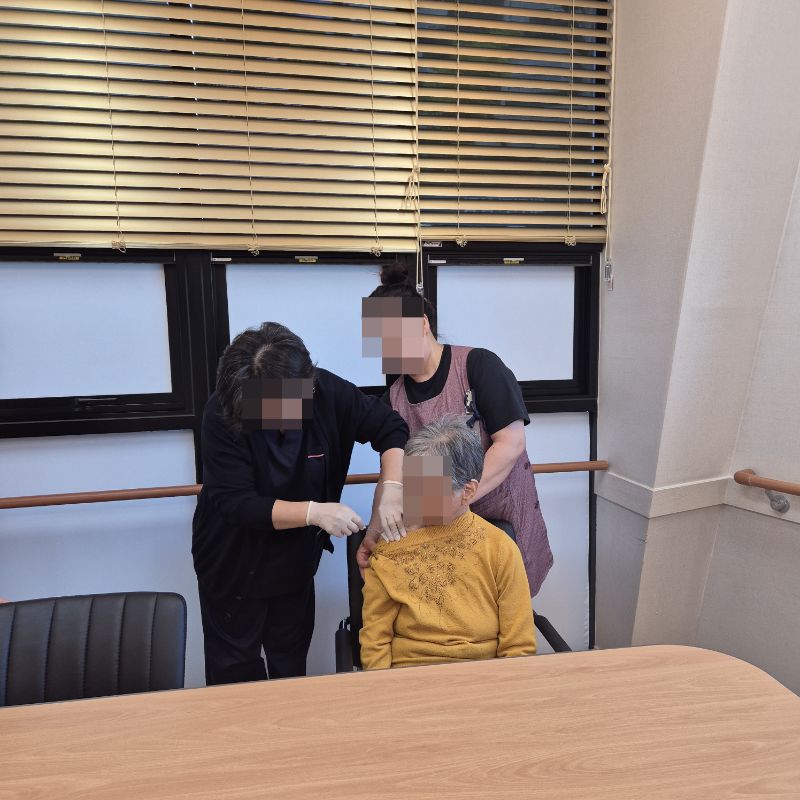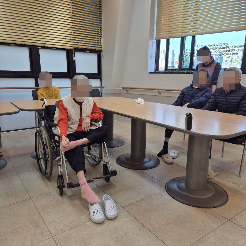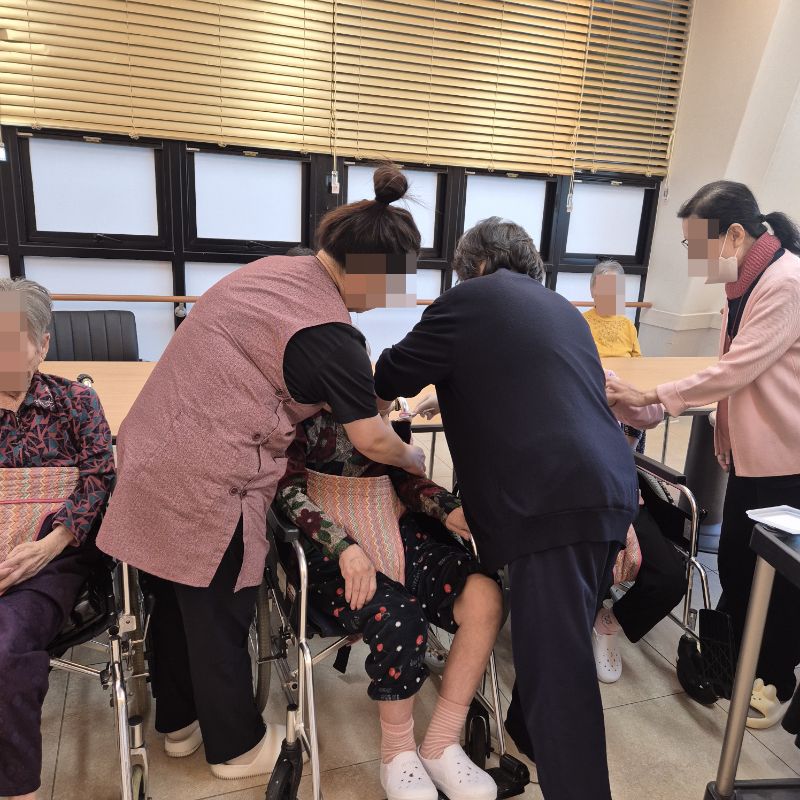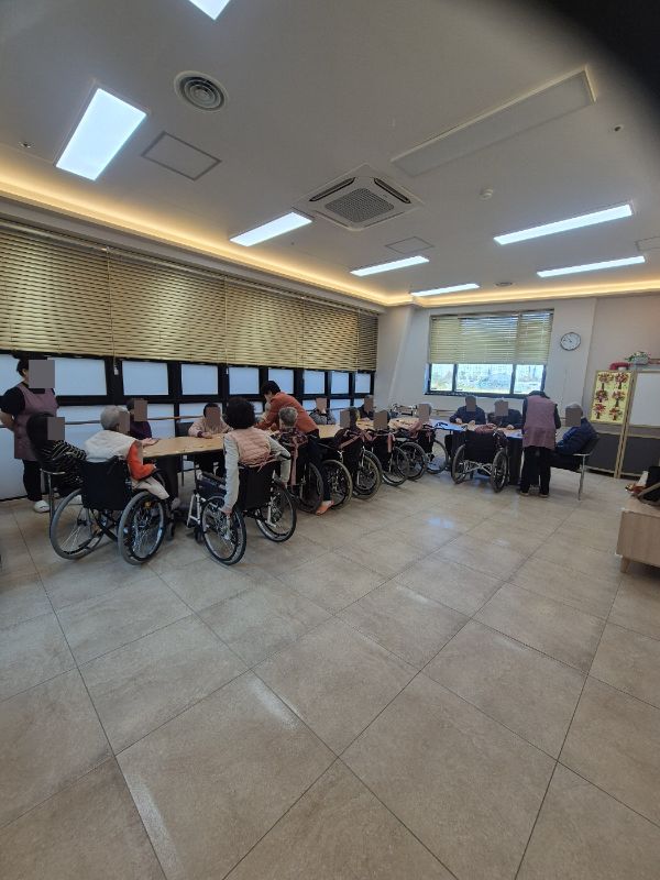⚬ 11월 14일 금요일_ 여가지원의 날 ⚬ 관리자 2025-11-14 17:18 오전: 코로나예방접종-코로나를 예방하기위해 예방접종을 하셨습니다.면역력이 쑥쑥 생겨서 코로나 없는 시간이 되시길 바랍니다.오전프로그램 : 외부강사 – (인지)목표: 인지향상에 도움을 주고며 원하는 작품을 완성할때 성취감을 준다. 계절에 맞는 재료의 내용을 살펴 보고 경험담을 이야기 나눠 본다.기대효과: 계절에 맞는 재료를 사용하여 계절의 변화에 적응할수 있다. 경험담을 이야기하며 자신감을 갖는다.오후프로그램 : 침상 관절 운동(신체)목표: 관절의 가동 범위 유지 및 개선. 근육 경직 예방과 혈액순환 촉진. 욕창과 근골격계 합병증 방지. 전신의 이완과 정서적 안정 도모한다.기대효과: 관절 유연성과 근력 강화로 신체기능 유지 및 개선. 삼킴 능력 향상으로 안전한 섭취 지원. 손과 팔의 조작 능력 향상으로 일상생활 자립도 증가. 균형 감각 및 조화운동 능력 개선으로 낙상 위험 감소. 지구력 증대로 신체 활동량 증가 및 전신 건강 증진한다. 다음글 ⚬ 11월 17일 월요일_ 자기존중의 날 ⚬ 이전글 ⚬ 11월 12일 수요일_ 창의성의 날 ⚬ 목록