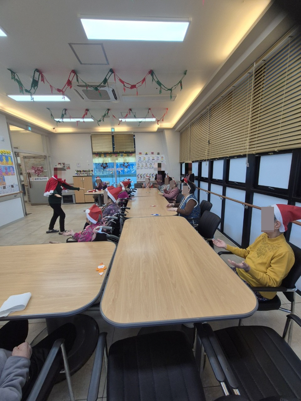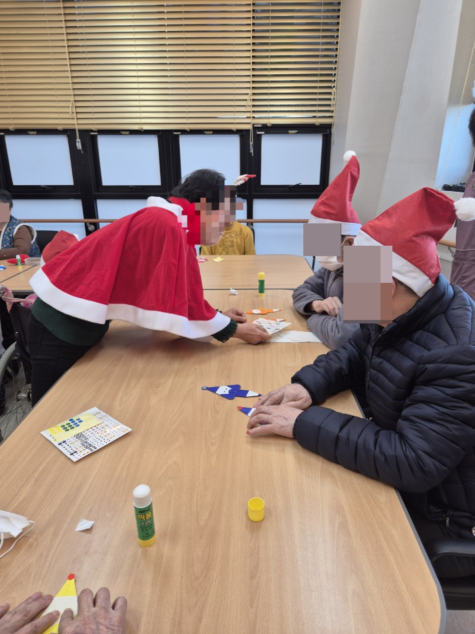 ⚬ 12월 12일 금요일_ 여가지원의 날 ⚬ 관리자 2025-12-22 17:25 오전프로그램 : 외부강사 – (인지)목표: 인지향상에 도움을 주고며 원하는 작품을 완성할때 성취감을 준다. 계절에 맞는 재료의 내용을 살펴 보고 경험담을 이야기 나눠 본다.기대효과: 계절에 맞는 재료를 사용하여 계절의 변화에 적응할수 있다. 경험담을 이야기하며 자신감을 갖는다.오후프로그램 : 밴드 스트레칭(신체)목표: 근육 유연성 증진 및 관절 가동 범위 확대. 통증 감소와 긴장 완화. 근육과 관절의 부상 예방. 전신 순환 개선으로 신체 활력 증대한다.기대효과: 근육과 관절의 유연성 향상으로 움직임 개선. 긴장된 근육과 통증 완화로 신체적 편안함 제공. 혈액순환 개선으로 신체 활력 증대. 스트레스 감소 및 정서적 안정감 증대. 일상생활 동작 수행 능력 강화한다. 다음글 ⚬ 12월 15일 월요일_ 자기존중의 날 ⚬ 이전글 ⚬ 12월 10일 수요일_ 창의성의 날 ⚬ 목록