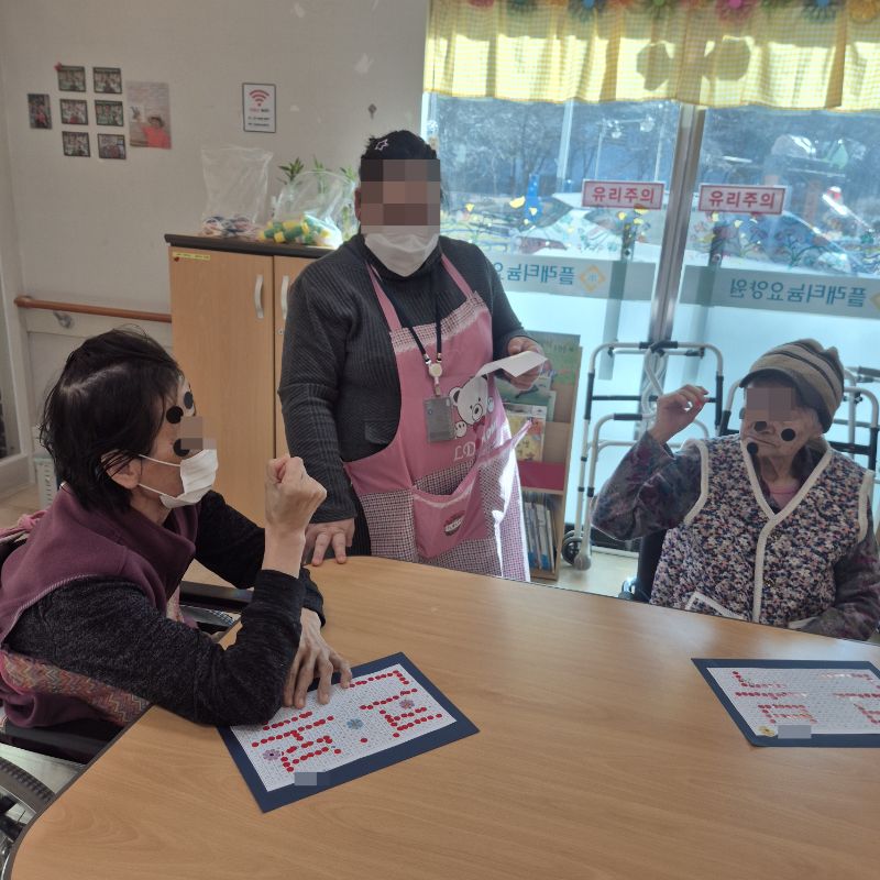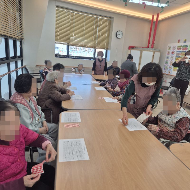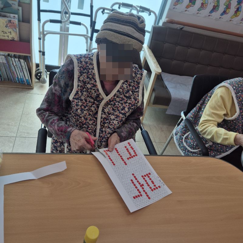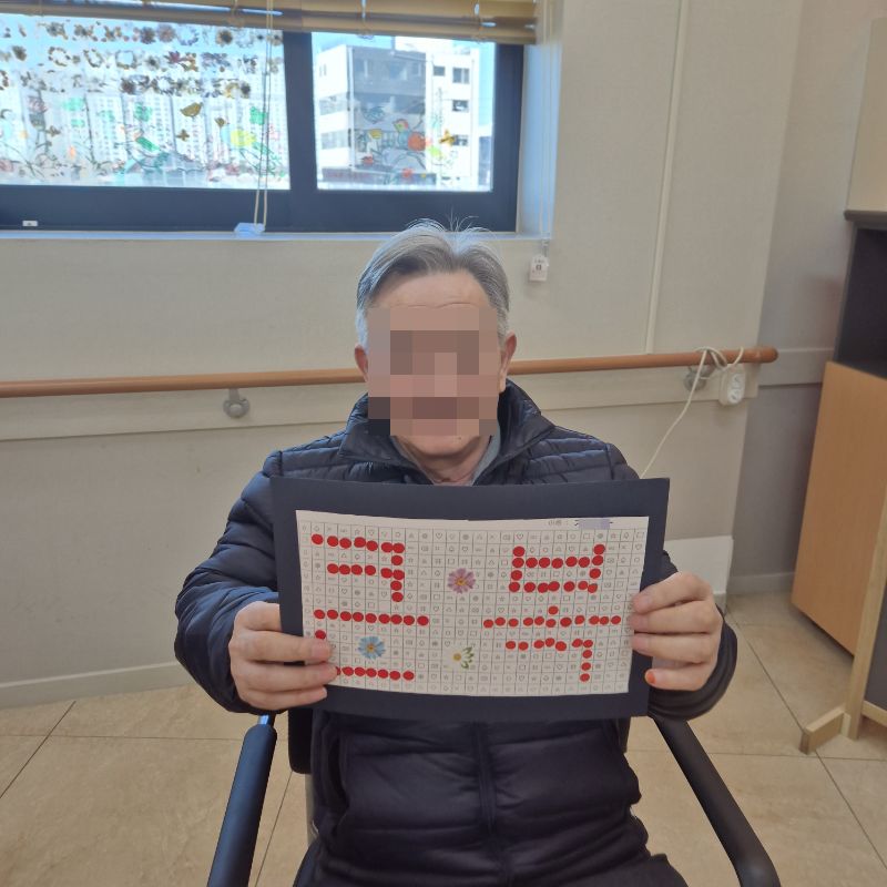 ⚬ 1월 6일 화요일_ 호기심의 날 ⚬ 관리자 2026-01-06 17:32 오전프로그램 : 민요부르기(여가)목표: 청각적 음악적 자극을 통해 인식기능 향상, 주의력 향상, 소근육 운동, 언어 능력 훈련, 기억력 증가, 기분 전환 및 우울증 감소, 불안감과 스트레스를 해소한다.기대효과: 청각 자극, 기분전환 및 우울증 감소, 불안감과 스트레스 해소한다.오후프로그램 : 외부강사 – (인지)목표: 인지향상에 도움을 주고며 원하는 작품을 완성할때 성취감을 준다. 재료의 내용과 사용방법의 변화 알아본다.기대효과: 새로운 소재의 재료로 창의력을 증진한고 완성된 작품을 보며 성취감을 느껴 만족감 형성 한다. 다음글 ⚬ 1월 7일 수요일_ 창의성의 날 ⚬ 이전글 ⚬ 1월 5일 월요일_ 자기존중의 날 ⚬ 목록
