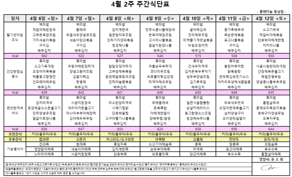 ㅇ 4월2주 식단표 ㅇ