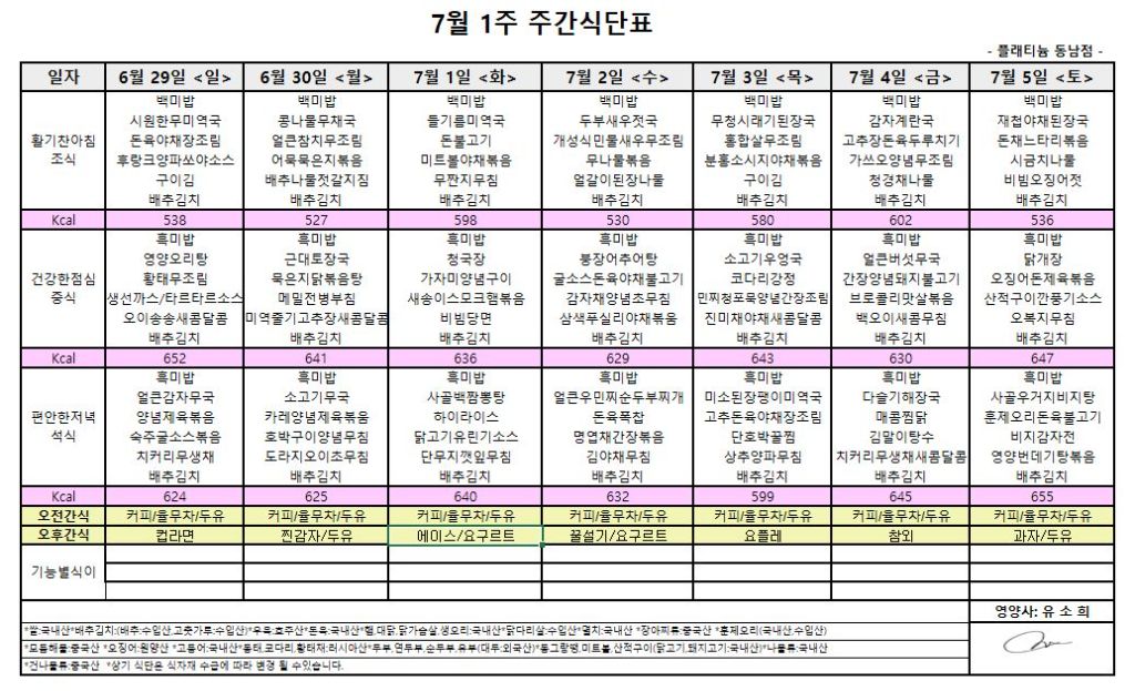 ㅇ 7월1주 식단표 ㅇ