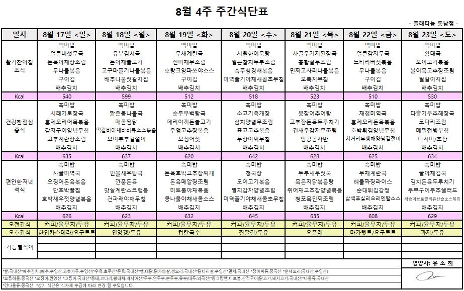 ㅇ 8월3주 식단표 ㅇ