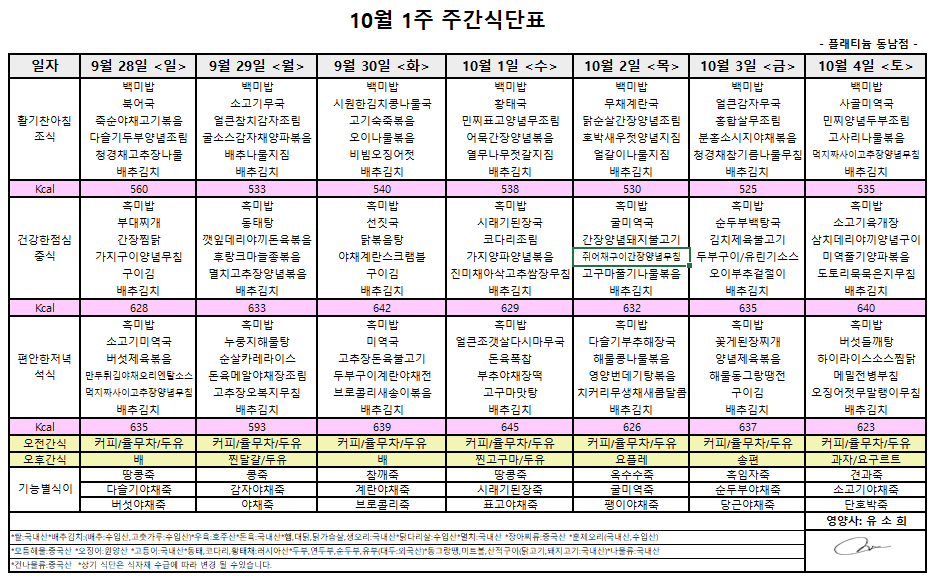 ㅇ 10월1주 식단표 ㅇ